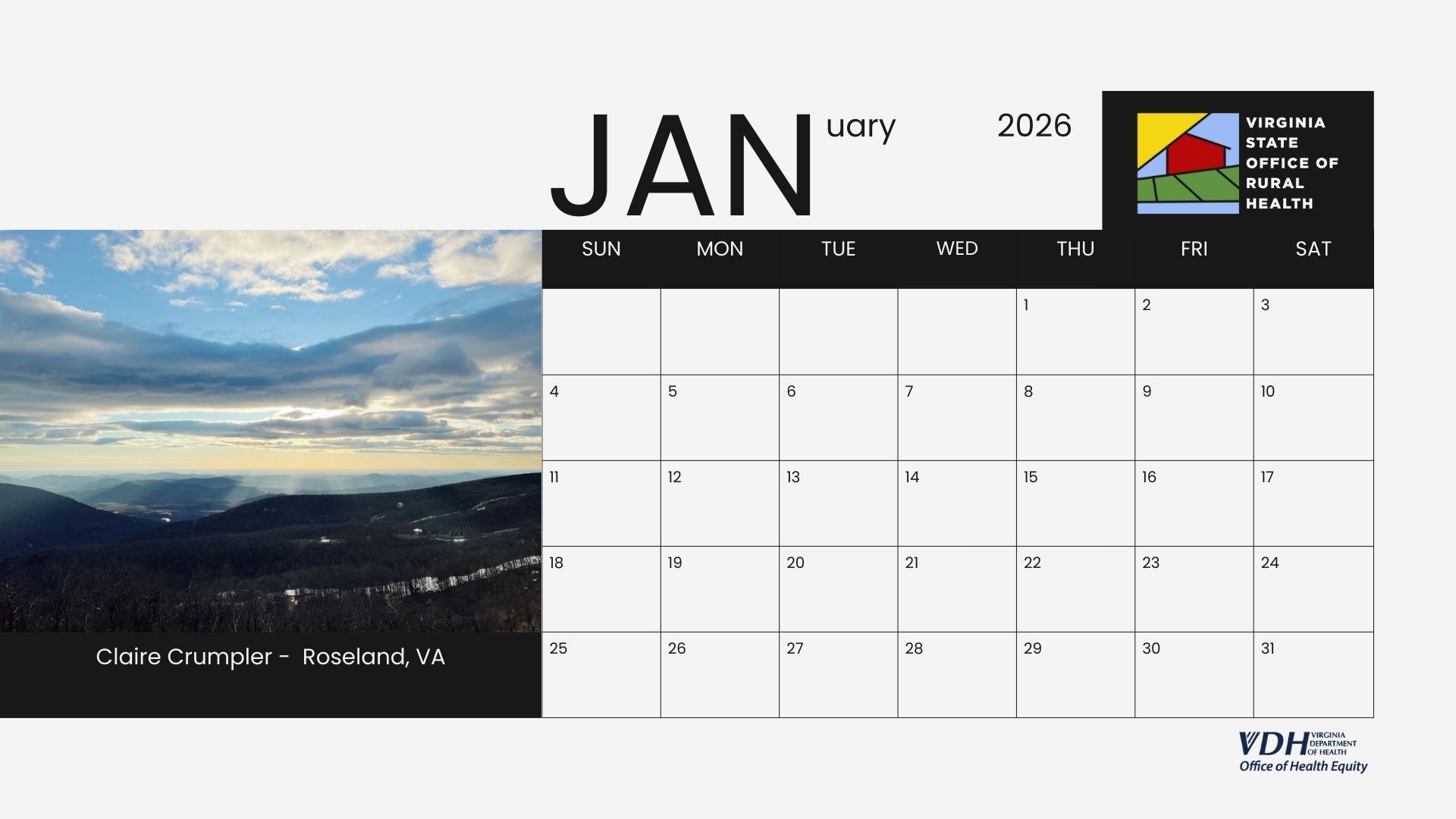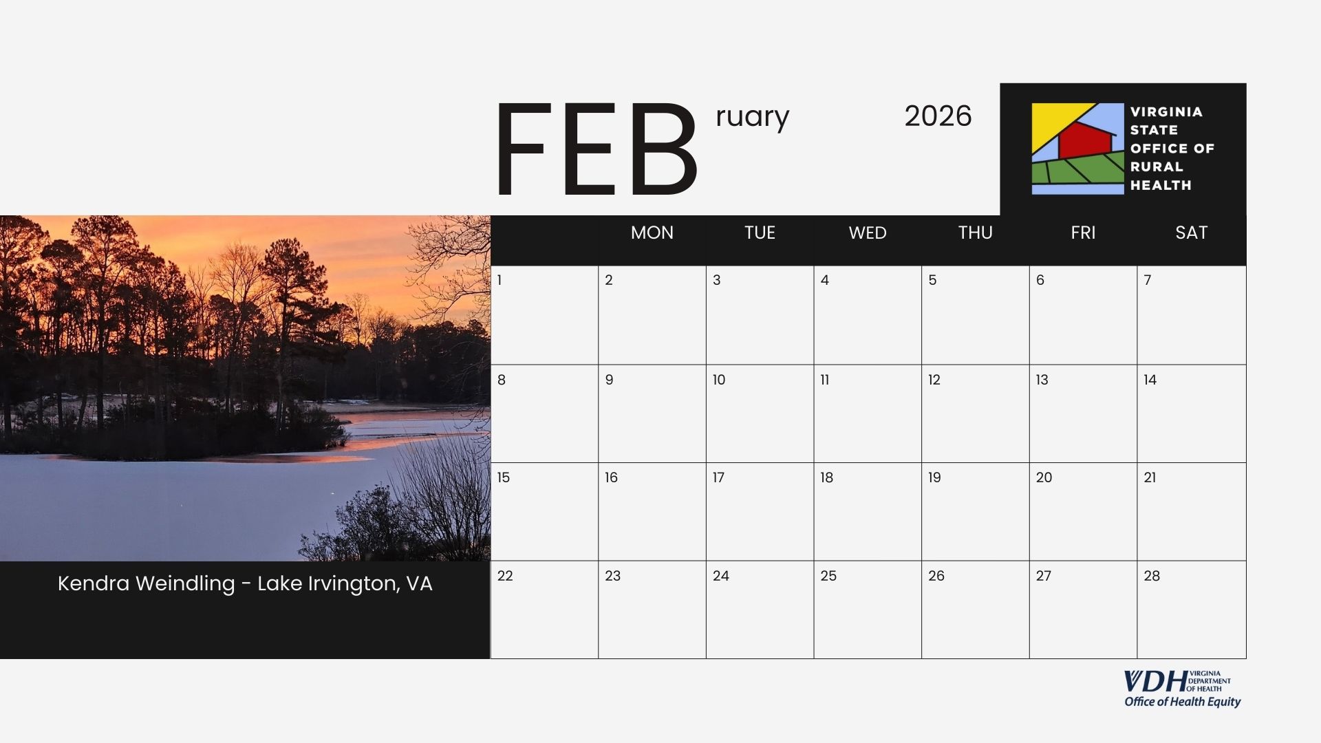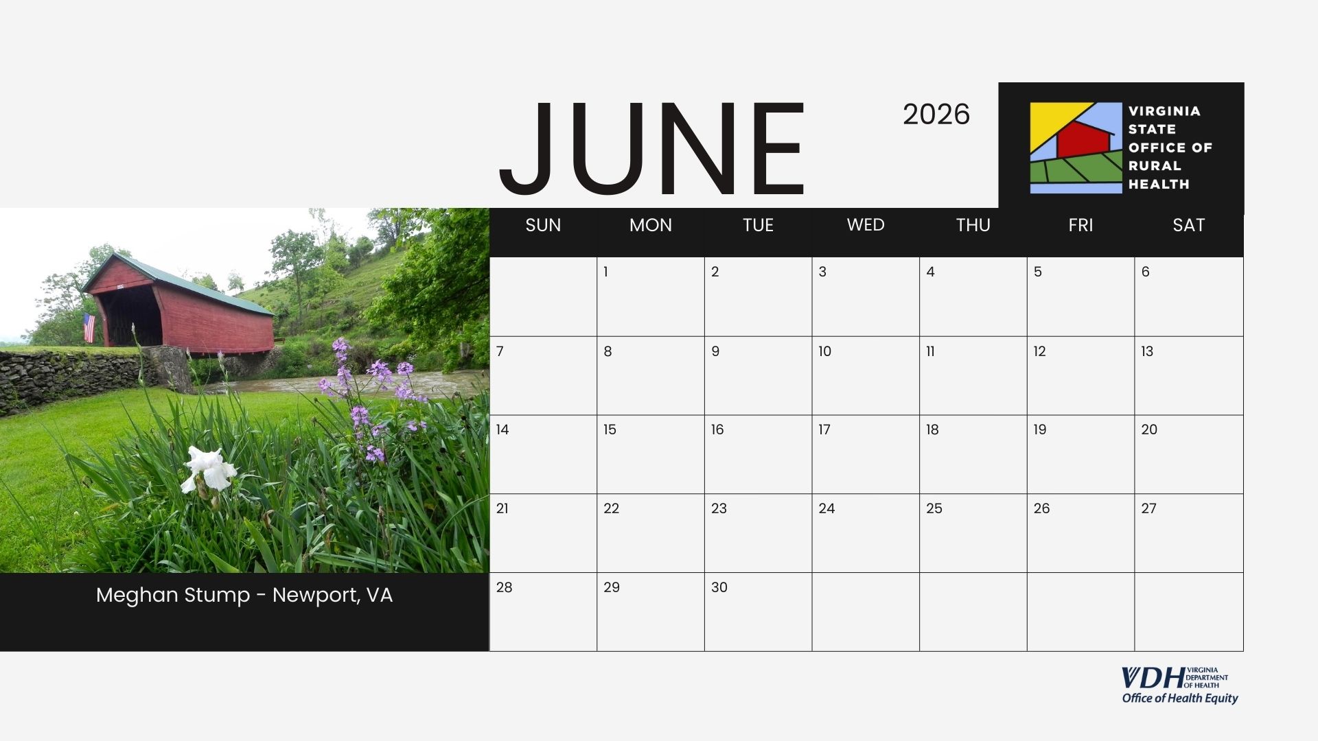 We are excited to introduce the 2026 Virginia State Office of Rural Health (VA-SORH) Digital Community Calendar series. The annual VA-SORH Photo Contest aims to highlight the beauty of Virginia's rural communities.