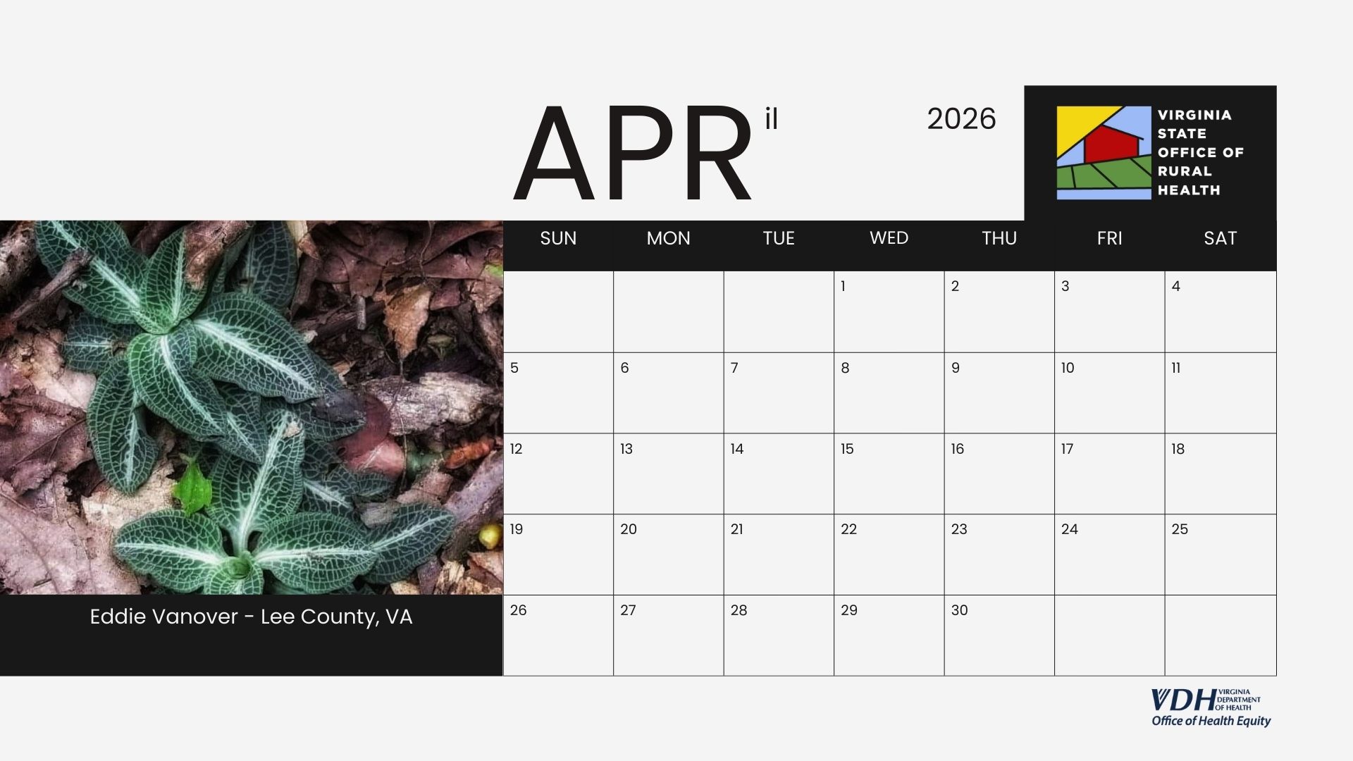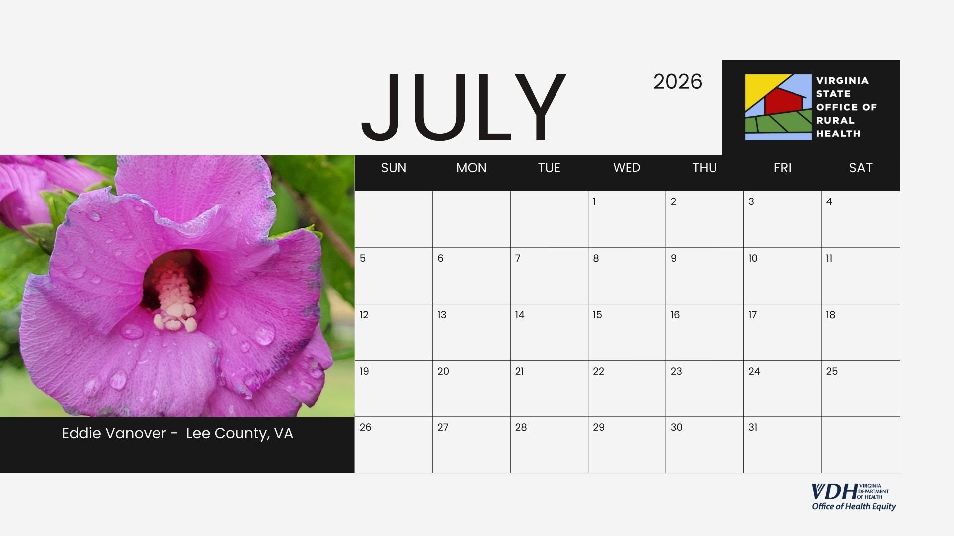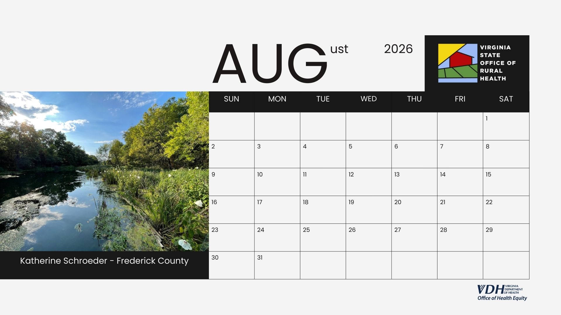 We are excited to introduce the 2026 Virginia State Office of Rural Health (VA-SORH) Digital Community Calendar series. The annual VA-SORH Photo Contest aims to highlight the beauty of Virginia's rural communities.