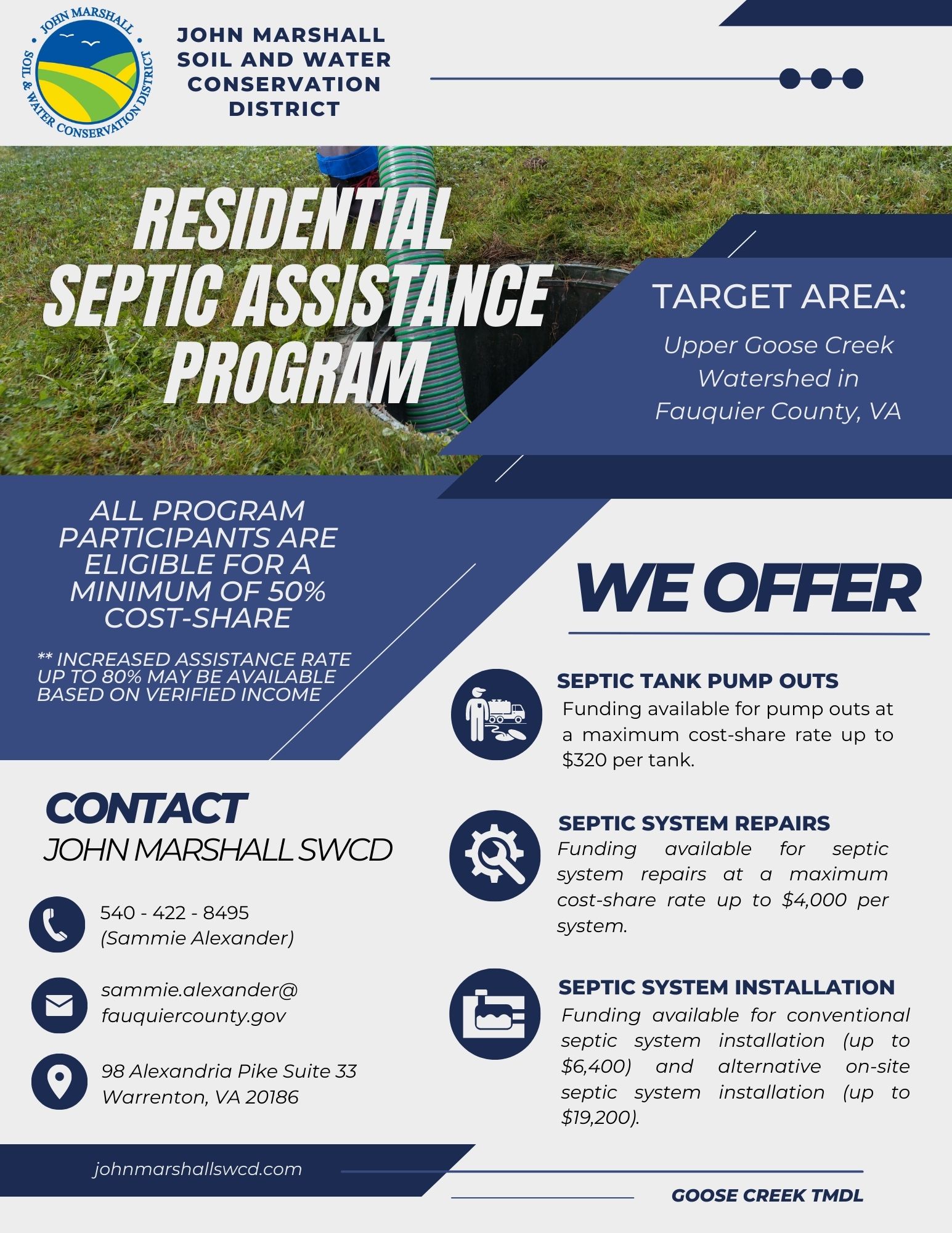 The John Marshall Soil and Water Conservation District (JMSWCD) currently has a Residential Septic Assistance Program for homeowner with septic systems in the Upper Goose Creek Watershed in Fauquier County. *Click image to enlarge*