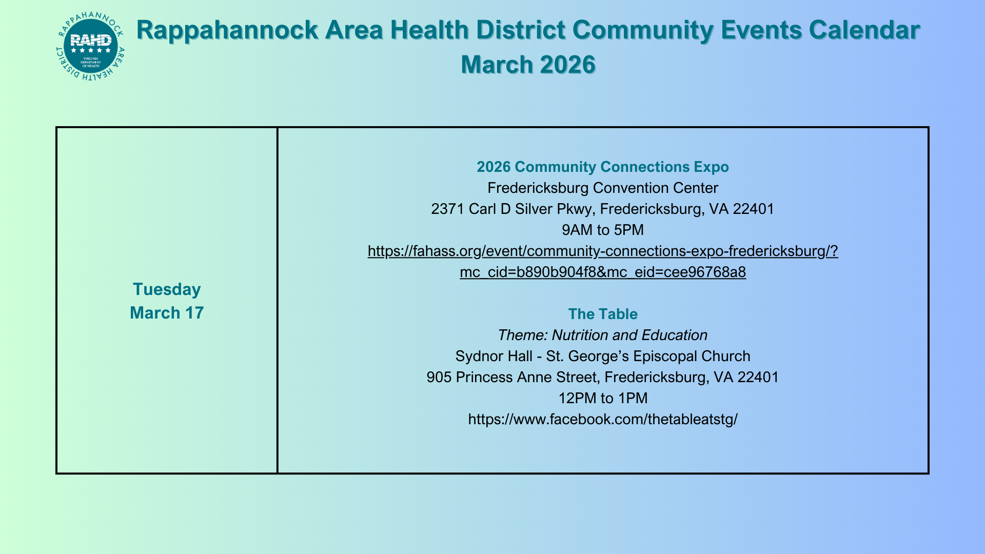 Community Events Want to find RAHD at upcoming Community Events? Here’s a calendar of events we will be participating in this month! Last Updated: March 9, 2026